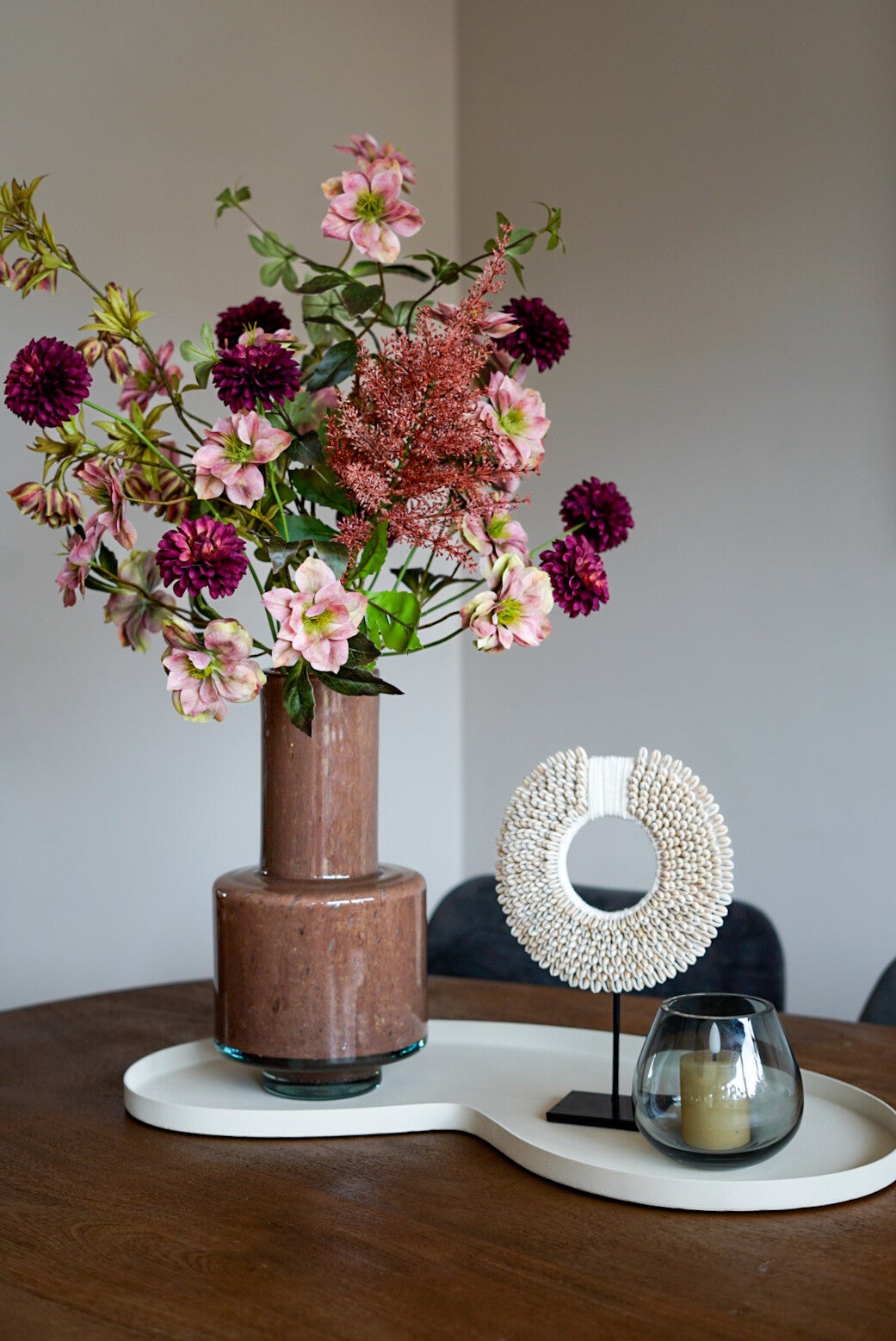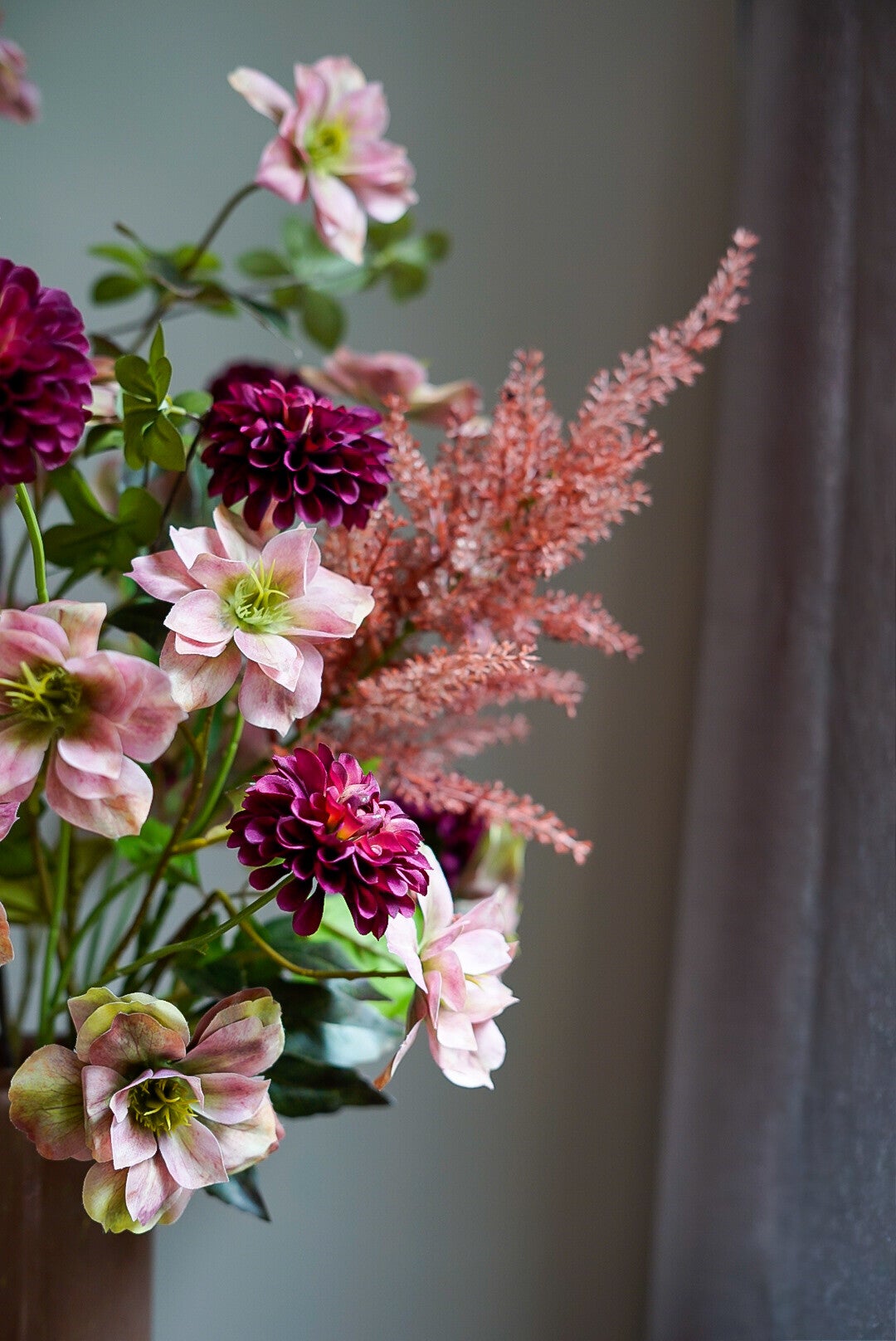Dit zijden boeket is een feest voor het oog. De zachte oudroze helleborus straalt rust en elegantie uit, terwijl de volle paarse dahlia’s zorgen voor een vleugje speelse luxe. De fijne campanula maakt het geheel luchtig en fris alsof je een stukje bloeiende tuin in huis haalt.
