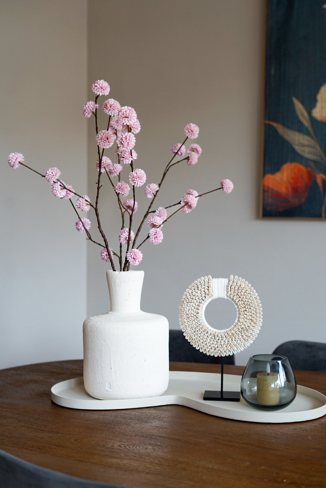 De vaas combineert prachtig met onze bloesemtakken of een paar volle pompom takken. Door haar robuustheid staat ze stevig en stabiel, terwijl de neutrale kleur en verfijnde afwerking ervoor zorgen dat ze in vrijwel ieder interieur past – van landelijk tot modern.