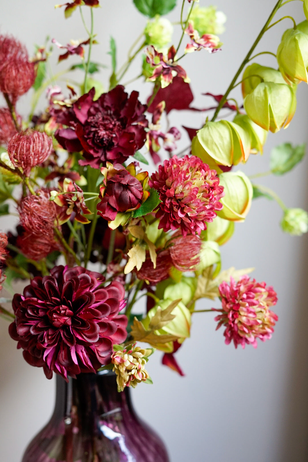 Laat je interieur stralen met het zijden boeket Sophie. De diepe bordeauxrode tinten, gecombineerd met rijke herfstkleuren, geven elke ruimte een chique en tijdloze sfeer. Met zorg samengesteld, blijft dit boeket seizoen na seizoen prachtig zonder onderhoud.