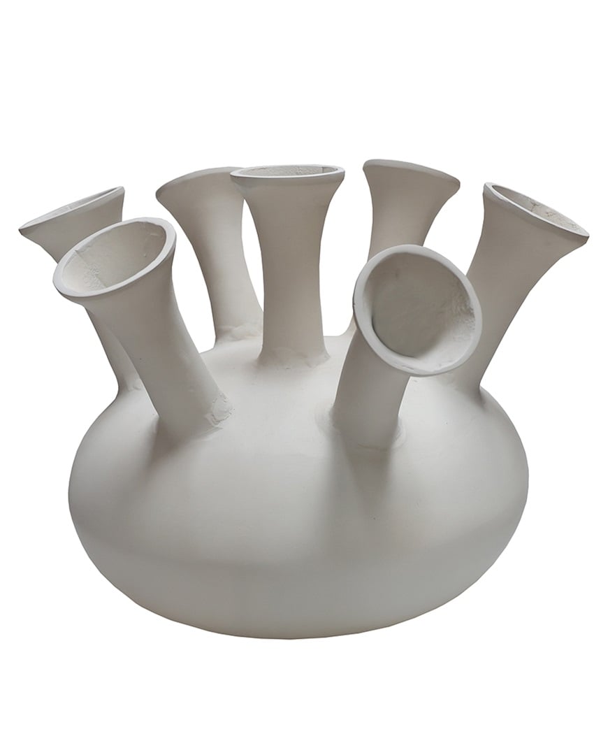 Deze stijlvolle metalen toetervaas met 7 speelse openingen is hét statement piece dat jouw interieur laat stralen. Het unieke silhouet geïnspireerd op de klassieke tulpenvaas maar uitgevoerd in een moderne, strakke vorm, laat zijde bloemen prachtig uitkomen en geeft elke ruimte een kunstzinnige, levendige touch. Verkrijgbaar in het ivoor en perfect om jouw creativiteit in volle bloei te zetten.